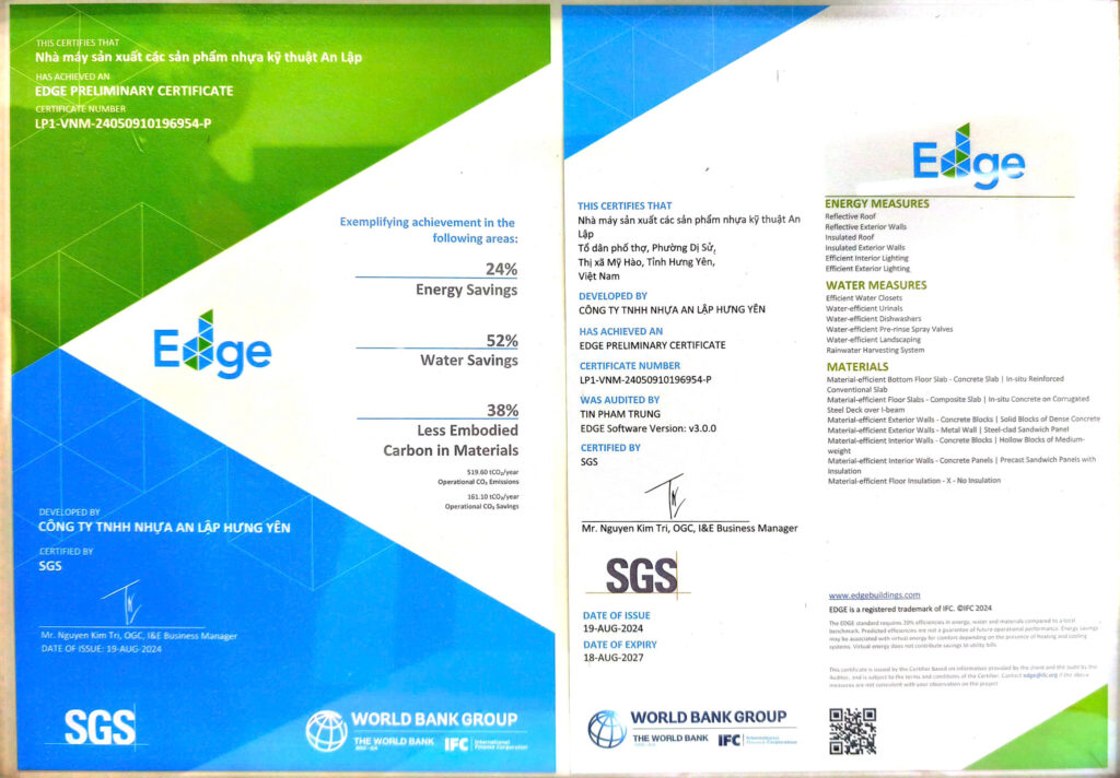 Chứng chỉ công trình 𝗫𝗔𝗡𝗛 – 𝗘𝗗𝗚𝗘 của tổ chức tài chính quốc tế IFC thuộc World Bank do SGS cấp chứng nhận Có thể bạn quan tâm: PHÓNG TĨNH ĐIỆN LÀ GÌ? NHƯ THẾ NÀO ĐƯỢC COI LÀ PHÓNG TĨNH ĐIỆN? Thế nào gọi là túi chống tĩnh điện?